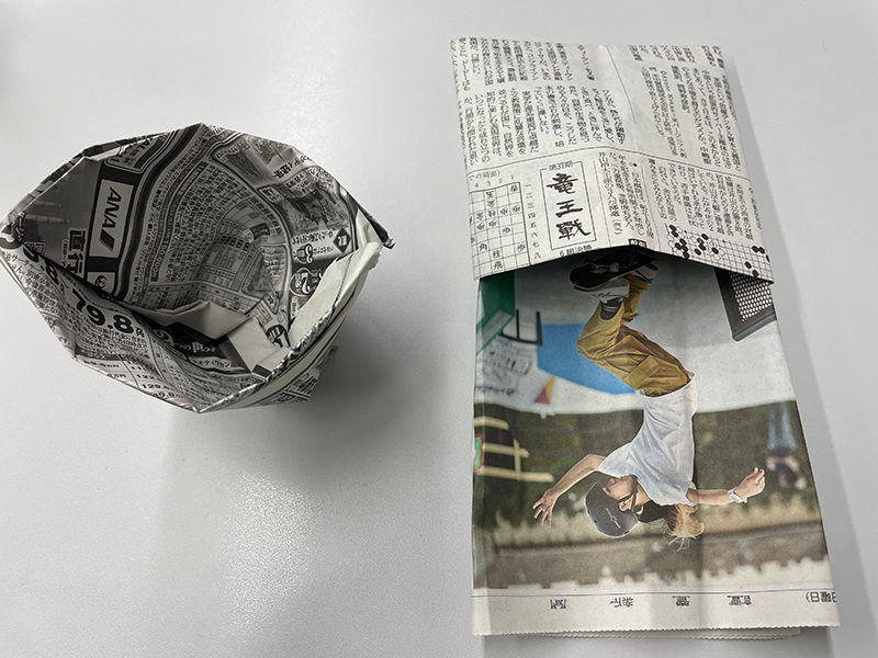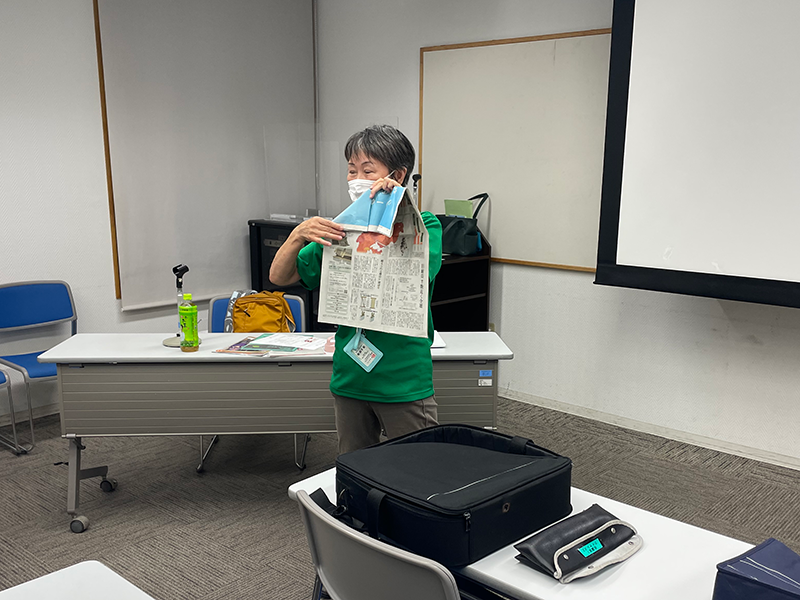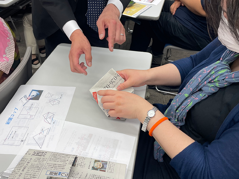 赤羽様の御指導のもと参加者全員に新聞を配り作って体験していただきました。