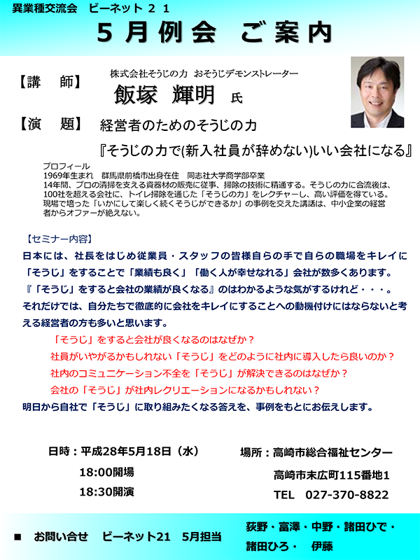 【日時】平成28年5月18日(水) 18:00 開場 18:30 開演【場所】高崎市総合福祉センター/高崎市末広町115番地1【演題】経営者のためのそうじの力『そうじのちからで(新入社員がやめない)いい会社になる』【講師】株式会社そうじの力 おそうじデ...