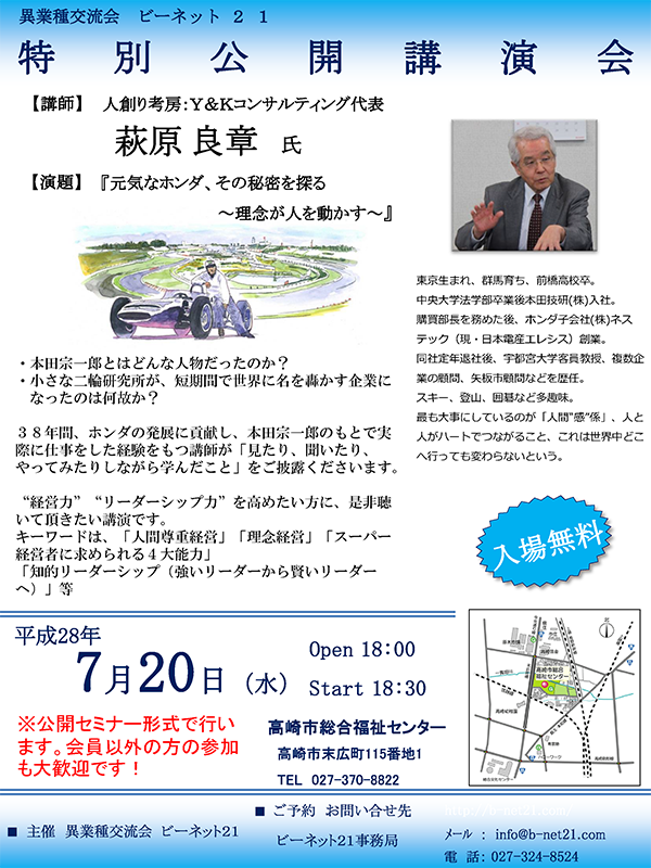 【日時】平成28年7月20日(水) 18:00 開場 18:30 開演【場所】高崎市総合福祉センター/高崎市末広町115番地1【演題】『元気なホンダ、その秘密を探る〜 理念が人を動かす〜』【講師】 萩原良章 先生(元本田技研社員、元宇都宮大学客員教授) 【講演内... -