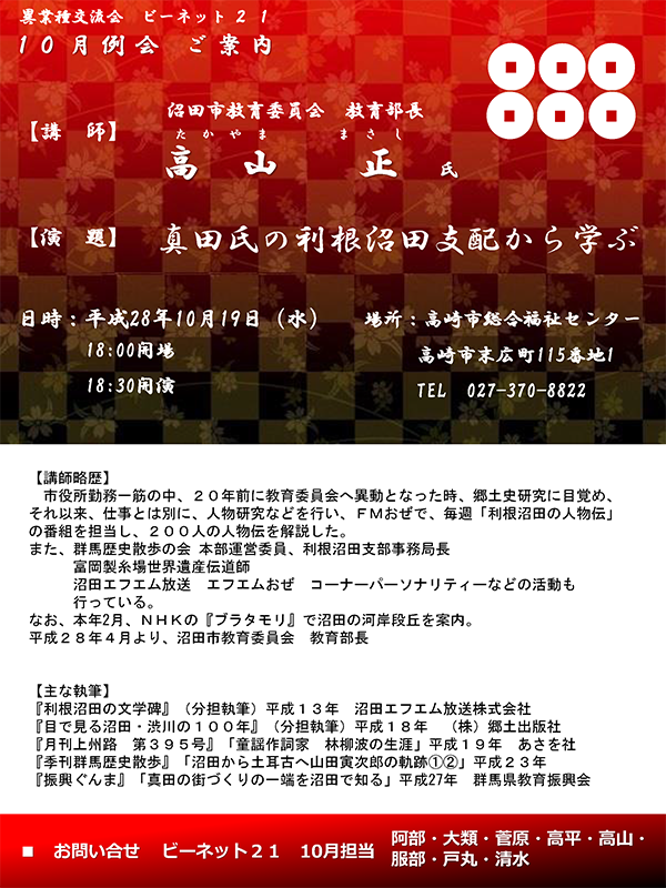 【日時】平成28年10月19日(水) 18:00 開場 18:30 開演【場所】高崎市総合福祉センター/高崎市末広町115番地1【演題】真田氏の利根沼田支配から学ぶ」【講師】沼田市教育委員会教育部長 高山 正 氏 ■講師略歴沼田市役所勤務一筋の中、20年前に教育委員... -