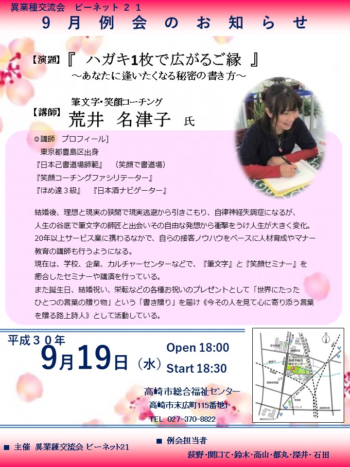【日時】2018年9月19日(水)18:00~【場所】高崎市総合福祉センター/高崎市末広町115番地1 TEL 027-370-8822【内容】『 はがき1枚で広がるご縁 』~あなたに逢いたくなる秘密の書き方~【講師】荒井 名津子(なっちゃん)先生 【講演内容】■自己紹介筆... -